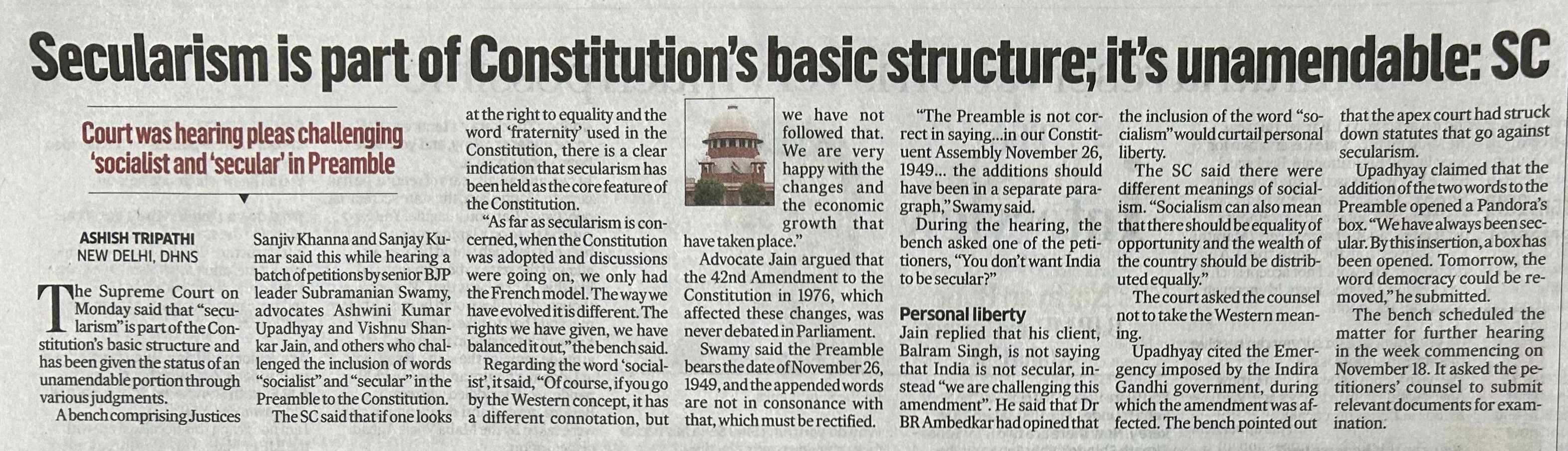 | Secularism is part of Constitution's basic structure; it's unamendable: SC, by Ashish Tripathi. In Deccan Herald, 22 October 2024. |